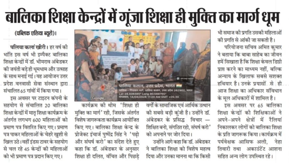 As in previous years this year too Baba Saheb Dr. Bhimrao Ambedkar s Jayanti was celebrated at the Impact Girls Education Centers operated by the Uttar Pradesh Vanvasi Seva Sansthan across 65 villages. During these celebrations certificates were distributed to 600 women under the Maternal Education Program at the 20 Girls Education Centers supported by the Titan Company. The women s faces lit up with joy upon receiving these certificates; additionally certificates were also distributed to women at the 45 centers supported by Indus Towers. On this occasion, the Uttar Pradesh Vanvasi Seva Sansthan organized special programs at the Girls Education Centers centered around the theme: Education is the Path to Liberation.
